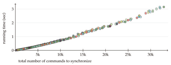 In the experiments, we tried 20 different filesystems with the parameter S running from 5 to 14 (inclusive), T running from 1 to , and the number of users running from 2 to , inclusive. The general synchronization Algorithm 7 from Section 6 was called on the resulting collection of sequences to generate the first and the first three possible synchronized states. Each run was repeated 10 times to smooth out the effects of other programs running on the same server. Figure 3 depicts the average time used to generate a single synchronizing command set. The input size on the x axis is the total number of different commands in the sequences to be synchronized. The average running time on the y axis is in seconds. The non-optimized Python program was running on a desktop machine with an Intel(R) Core(TM) i5-8250U CPU @ 1.60 GHz processor and 8 G memory. The different colors represent the number of replicas. The results confirm that the running time is subquadratic in the total input size and does not depend on the number of replicas.