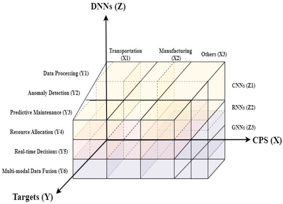 In this section, the state-of-the-art DNNs used to handle spatial-temporal data in CPS are explored. As shown in Figure 3, a three-dimensional framework is proposed, in which X-axis indicates the CPS domains (transportation, manufacturing, and others), the Y-axis displays the targets (spatial-temporal data processing, anomaly detection, predictive maintenance, resource allocation, real-time decision, and multi-modal data fusion, among others), and the Z-axis reveals the different types of DNNs (i.e., CNNs, RNNs, and GNNs). Note that the purpose of mapping (say , , ) is to categorize the existing effort in the designed 3D framework. Recall that, in the X-axis, denote the transportation CPS as , manufacturing CPS as , etc.; in the Y-axis, denote as data processing, as anomaly detection, as predictive maintenance, as resource allocation, as real-time decisions, and as multi-modal data fusion; in Z-axis, denote CNNs as , RNNs as and GNN as , respectively. Given that a specific DNN (say RNN) is applied to anomaly detection in transportation CPS, the corresponding effort can be categorized as (, , ) in the defined framework.