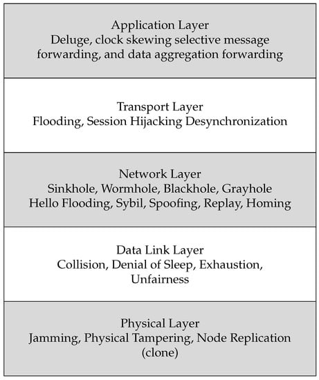 | Physical or Node Tampering | An attacker physically accesses a compromised node and takes over the control, for example, to obtain sensitive information such as transmission keys [52,53]. | ||