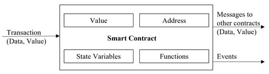 - Smart contract: a piece of code that adds customizability to a BC. It represents an arrangement and executes itself automatically under a predetermined set of rules and conditions without a third party. Smart contracts can be used for node verification and authentication. The input of the smart contract is the transaction, which is executed with a corresponding code that consists of the value, address, functions, and state to generate the output events (see Figure 9) [112].