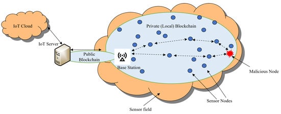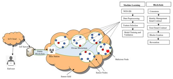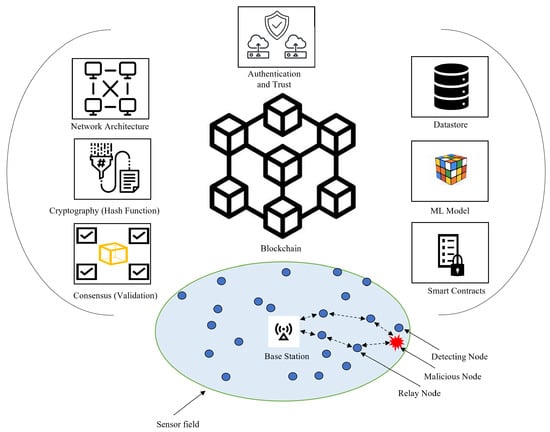 - Nouman, M.; Qasim, U.; Nasir, H.; Almasoud, A.; Imran, M.; Javaid, N. Malicious Node Detection using Machine Learning and Distributed Data Storage using Blockchain in WSNs. IEEE Access 2023, 11, 6106–6121. [Google Scholar] [CrossRef]
