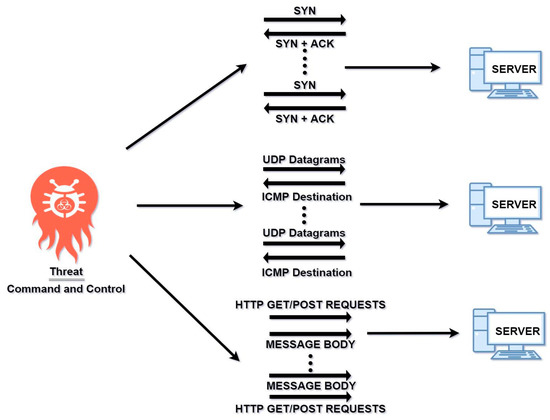SYN for TCP, UDP, and HTTP attack communication channels.