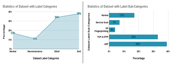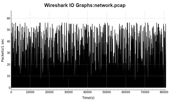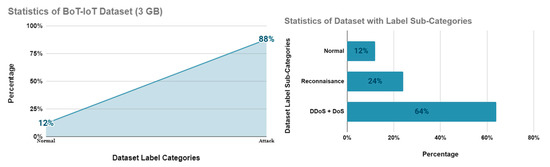 Figure 5 shows the exact trace of how a file named network.pcap on a simulated environment can store packet data over time. Figure 6 provides data percentage statistics of the degree of data characteristics. The Denial of Service (DoS) comprises the highest percentage of the dataset, at 38%, whereas the Reconnaissance attack comprises the least, at 11%, in the generated dataset. The Dos and DDoS records hold the highest value due to the involvement of all three TCP, UDP, and HTTP attacks from the simulated environment. The Reconnaissance attack has the Service Scan and OS Fingerprinting attacks on its sub-categories, while the normal network is the simulated network without any intervention of botnet threats in the simulated environment.