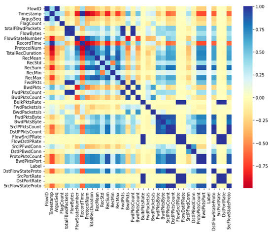 where signifies the sample mean of variable x, and signifies the sample mean of variable y. To find the correlation between the features in a dataset, a script in Python to examine the correlation coefficient was created, and the attributes were ranked in a range of −1 to 1. The average correlation for each feature was also computed to identify the features that would introduce less uncertainty in the dataset. When there is a strong relation between two features, one feature from the pair can be eliminated. Hence, if there is a strong relation, the value of the pair comes close to 1, which signifies that X is highly correlated to Y, while a value close to −1 suggests a negative correlation. If there is no correlation, then the correlation coefficient provides the result of 0 [32]. In the dataset, the threshold was set to 0.90, as it helps obtain the highly correlated feature from the set and helps in the feature reduction. One of the pairs with a threshold greater than or equal to 0.90 was eliminated, and also the correlation relation between each of the different variables opposed to the target was also considered in the research. Figure 7 shows the Pearson correlation heatmap for the dataset where every feature pair with a higher or equal to 0.90 correlation is dropped for the machine learning model training.