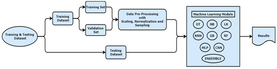 This utilizes the cross-dataset selection of both BoT-IoT and the primary dataset that was generated. As explained previously, the BoT-IoT dataset is a very popular and well-managed dataset in the research field of the IoT. A total of 3 Gb of data from each of the datasets were merged together for this process of cross-dataset evaluation. The dataset was tested for similarity to each other, and collectively, both of the dataset features were reduced with the help of data preprocessing techniques, as discussed earlier. Figure 8 provides information about how the machine learning technique is initiated for the process. As mentioned in the classifier section, the training and testing dataset is considered 80 and 20 percent of the total merged datasets. Considering the imbalanced dataset after merging both datasets, the scaling technique was utilized to attain the highest accuracy and computational efficiency. This enables the inclusion of multiclass classification, where the samples are determined according to the attack class they belong to. The ML models were developed using the top 10 and 20 features to determine the most comprehensive list of features for achieving the peak level of accuracy in the ideal supporting time. Table 10 provides the comparison of different classifiers utilized for best 10 features from the dataset.