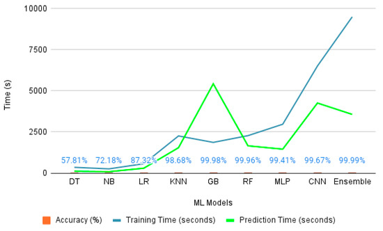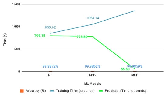 Regarding the binary classification of network data, the best 20 features showed an increase in classification accuracy. Only the dataset generated was utilized in the process of binary classification, where we can see that the ML models are able to identify the normal behaving network and attack network with optimal accuracy. The MLP model here takes the highest training time, but predicts quickly. In KNN, an optimal number of neighbors, as discussed in the earlier section, also enabled the model to perform accurately. Data-preprocessing techniques and Z-score normalization also play a significant role. With the imbalanced dataset, imblearn also aided the model with the best data-preprocessing analysis. On the contrary, with 99.9872%, the random forest outshines the other models and has a better average in time management as well. The classification result analysis for the generated dataset is illustrated in Figure 10.