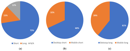 Figure 9 provides a glimpse into the nature of the various sessions based on their duration. A total of 73% of sessions displayed a duration below the average substantial session duration, while 12% of sessions did not record any duration at all, which, in this study’s case, translates to consisting only of a single HTTP request. The distribution among desktop and mobile devices presented in Figure 9 indicates a small preference for longer sessions on mobile devices, which might be the result of better engagement metrics, as they were analyzed in Section 4.3.1 of this chapter.