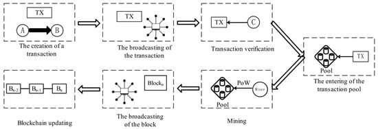 The full transaction lifecycle of blockchain includes seven stages: the creation of a transaction, the broadcasting of the transaction, transaction verification, the entering of the transaction pool, mining, the broadcasting of the block, and blockchain updating, as shown in Figure 2.