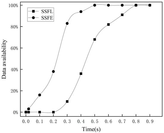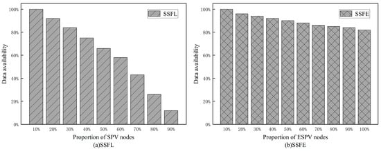 According to the experimental results in Figure 4, the time limits t in SSFL and SSFE were set to 0.8 s and 0.5 s respectively. If any data received by the node exceeded the time limit, it was deemed unavailable. The proportion of SPV nodes and ESPV nodes was continuously changed, and the changes in data availability are summarized in Figure 5.