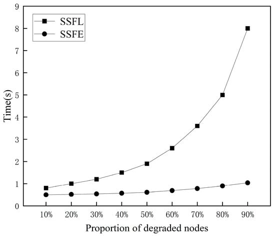 From Table 1, it can be seen that with the same proportion of degraded nodes, the storage redundancy of SSFE is higher than that of SSFL. From the experimental results in Figure 5, it can be seen that within a time limit, under the same proportion of degraded nodes, the data availability of SSFE is higher than that of SSFL.