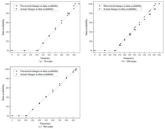 The experimental results suggest that the theoretical data availability is in good agreement with the actual changes. When the number of nodes is small, the data availability remains unchanged due to the failure to obtain target data. However, as the number of nodes increases, the number of situations where data availability remains unchanged due to not obtaining target data diminishes. It is worth noting that the theoretical change curve of data availability only represents the most likely trend of change, and that there may be some differences in the theoretical change curve due to actual probability differences. The time when the actual data availability reaches 100% in Figure 7b is advanced, and the reason for this situation is that the frequency of not obtaining the target data is relatively low. As the number of nodes increases, the theoretical change curve of data availability gradually matches the actual change curve, and thus, the DAMMB for degraded nodes has certain applicability for measuring data availability.