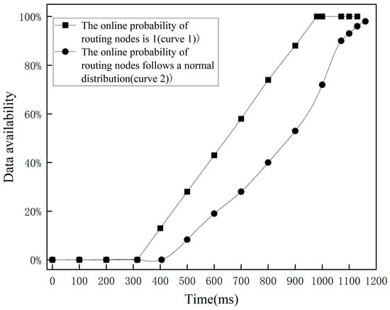 The experimental results illustrate that curve 1 represented the control group. The addition of a routing node prolonged the time from requesting information to receiving data. The data availability increased linearly after receiving data. Curve 2 represents the routing nodes that conformed to the actual online situation. The trend of curve 2 shows that the routing node initially went offline, causing data to be transmitted through the backup routing node and resulting in a delay time. Horizontally, when receiving data, curve 2 experiences a certain time delay when it reaches the same data availability as curve 1. Vertically, at the same time, the data availability level represented by curve 2 is lower than that represented by curve 1.