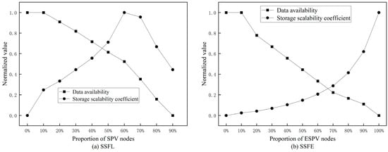 Changes in storage scalability coefficient and data availability. (a) SSFL; (b) SSFE.