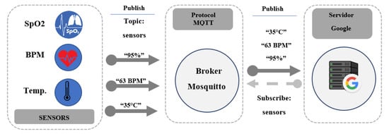 To transmit data to the web application, the research team utilized the MQTT messaging protocol, which is designed for efficient, lightweight communication in constrained environments. The protocol architecture, as shown in Figure 2, involves the acquisition of measured data, which is then published in the designated “sensors” topic. The Mosquitto broker is used to distribute this data to all subscribers, including the Google Cloud server hosting the virtual machine in this study. However, for this particular application, the Google Cloud server was the only subscriber utilized to receive and process the data. By implementing the MQTT protocol, the research was able to establish a reliable and secure communication channel for data transmission, enabling real-time monitoring and analysis of the measured data.