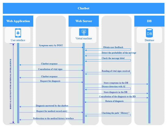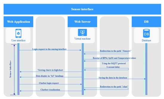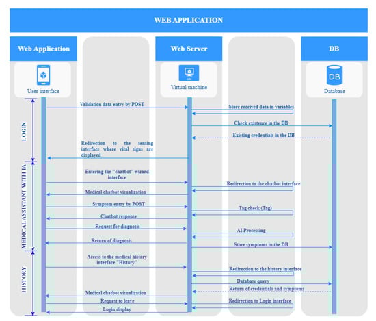 The development of the web application is based on the sequence diagram shown in Figure 4, starting from the user’s login, where a virtual machine hosted on the Google Cloud server checks whether the credentials entered are registered in the database to allow the user to continue to the sensorization tab where their vital signs are displayed. Once the user is in the sensorization interface, they can visualize through graphs and text boxes the values recorded by the sensors of the vital signs triage measurement device. After the sensor interface, the user enters the virtual assistant (chatbot) where the patient is asked to enter their symptomatology, which is stored in the database to predict their disease by means of the AI model created. Finally, the user can access the medical history of the consultation.