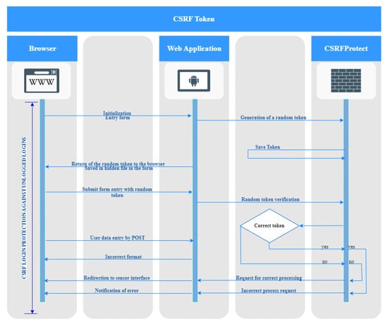 Additionally, security against cross-site request forgery or CSRF is implemented, where the user enters the user interface through a web browser and the server generates a token randomly and stores it using the “CSRFProtect” library. The generated token is sent back to the browser and is stored in a hidden form within the login validation form, where the user’s credentials are checked, including the token generated by the server. If the credentials and token are correct, the server redirects the user to the sensing interface, while if the token is incorrect or the web application is idle for more than 10 min, the token will expire and when trying to log in again will throw an error notification as in Figure 6, forcing the user to log in again.