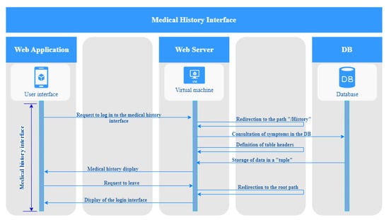 To ensure accurate and efficient access to medical records, the research team implemented a medical history interface within the application. The sequence diagram in Figure 9 explains how the interface operates, beginning with the user sending a request to access the interface. Once this request is received, the server is responsible for redirecting the browser to the path “/history”. The server then queries the database to define the headers of each column before obtaining the user’s data and joining everything in a tuple to generate the table with the history of consultations made by the patient. This enables the user to review their medical history and access critical information about past consultations. Once the user has reviewed the result of their query, they can exit the web application and will be automatically redirected to the login screen. This implementation of the medical history interface provides a user-friendly and efficient solution for accessing medical records remotely, enabling patients to stay informed about their health and providing medical professionals with the information needed for accurate diagnosis and treatment.