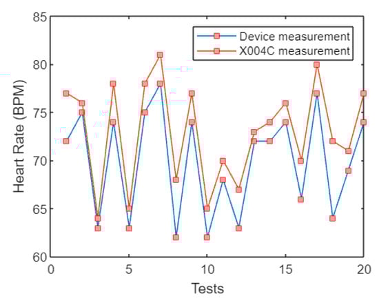 Figure 11 shows the behavior of the BPM measurements, where there is a trend of greater precision as the frequency range increases. There is a tendency for greater precision as long as the heart rate range is between 60 bpm and 65 bpm, since when the actual value is higher than 70 bpm the device presents a certain degree of difficulty when measuring. It is also important to mention that the MAX30100 sensor used is very sensitive to the position of the finger on the LEDs, so a bad positioning of the finger on the sensor will cause an erroneous measurement.