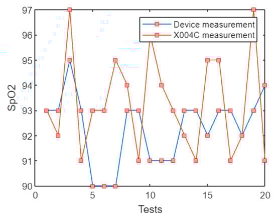 As shown in Figure 12, the behavior of the SpO2 measurements can be visualized, where there is a tendency for greater precision when the saturation level range is between 90% and 93%. When the real value is higher than 97%, the device begins to have a slight increase in measurement error. It should be noted that the accuracy of the measurement will depend on how the user positions their finger on the device, since a wrong positioning of the finger on the sensor will cause an erroneous measurement.