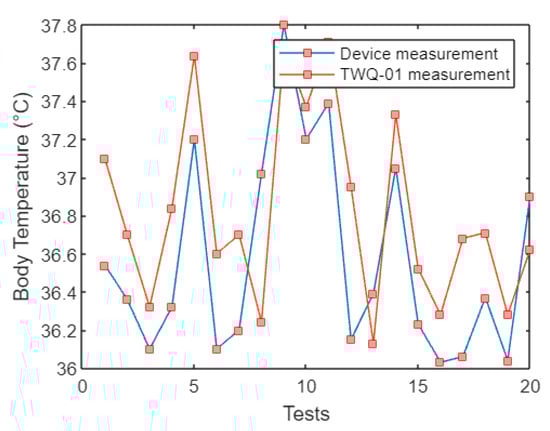 Figure 13 shows the behavior of the temperature measurements, which tend to be more accurate when the saturation level range is between 36.0 °C and 36.4 °C. When the real value is higher than 37 °C the device begins to show a small increase in measurement error. The accuracy of the temperature measurement will depend on the area to which the device is pointed, for this reason it was chosen to place the sensor near the palm of the user.
