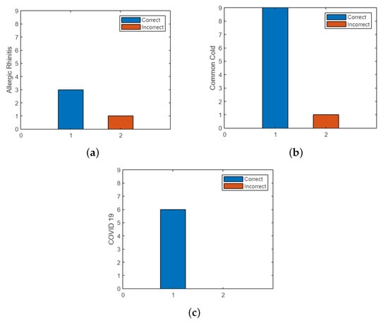 In Figure 14, it is observed that the allergic rhinitis class shows three hits with no errors, the common cold class obtained nine hits with one error, and the COVID-19 class had six hits with one error.
