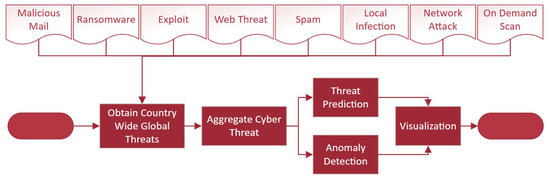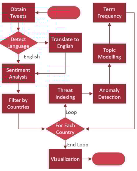 The proposed methodology incorporates the development of four distinct agents that interact with each other in a complex manner to fulfil the user’s goal of acquiring AI-based cyber intelligence across various countries. Figure 2 illustrates the integrated semantic multi-agent communication within this framework. Figure 2, Figure 3 and Figure 4 illustrate the building blocks and detailed sub-processes of the four agents. These sub-processes (i.e., language detection and translation, sentiment analysis, anomaly detection, term frequency generation, topic generation, and threat prediction) are explored here in further detail within Section 3.1, Section 3.2, Section 3.3, Section 3.4, Section 3.5, Section 3.6.