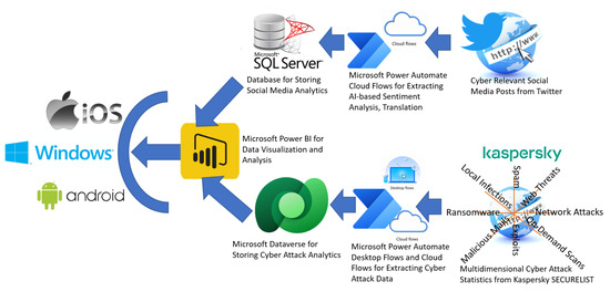 During the evaluation, the deployment structure portrayed in Figure 5 was used. Could-based Microsoft Power Platform and Microsoft Azure ecosystem were used for deploying the agents. Hence, industry-standard configurations were adopted for agent deployment. Agents in Microsoft Azure are deployed through Azure Automation, a cloud-based service facilitating the automation and orchestration of tasks across Azure resources and external systems. To initiate agent deployment, an Azure Automation account is created as the central management hub. Subsequently, the Azure Automation agent is installed on the target machine or virtual machine, enabling the execution of automation runbooks and establishing secure communication between the agent and the automation service. Configuration of agent settings, such as defining runbook worker groups, proxy settings, network access control rules, and resource management, follows the agent’s successful connection to the Azure Automation account. By assigning runbooks to the deployed agent within the Azure Automation account, desired automation tasks or workflows can be executed on the target machine. This deployment process empowers users to streamline their Azure resources through effective task automation and orchestration. As seen from Figure 5, technology building blocks, such as Microsoft SQL Server, Microsoft Dataverse, Microsoft Power Automate, and Microsoft Power BI, were used to generate AI-based cyber intelligence from both Twitter data and Kaspersky’s attack statistics (i.e., https://statistics.securelist.com/) (accessed on 3 March 2023).