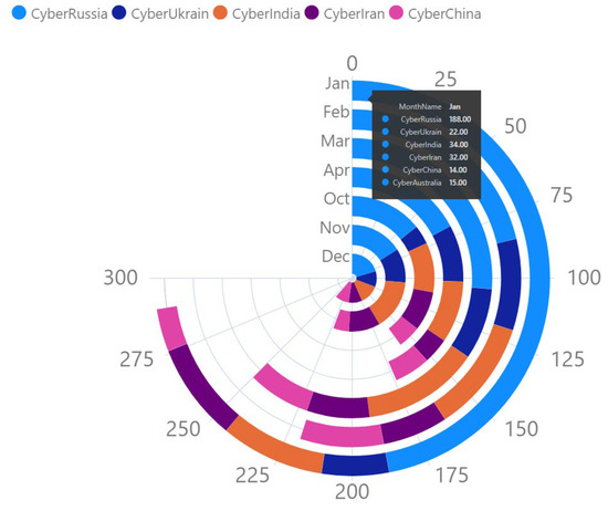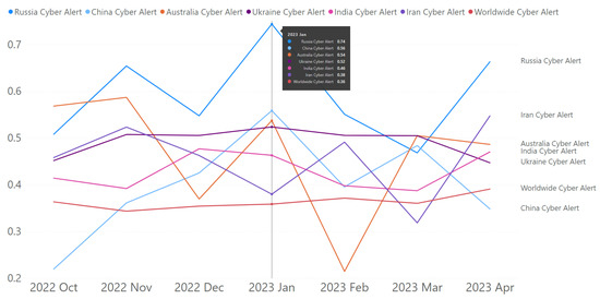 Table 6 presents comprehensive information on the Twitter data collected over a 7-month period. It includes the time frame, number of tweets, unique users, unique locations, unique languages, total retweets, average confidence scores for negative, neutral, and positive sentiment analyses, and the number of translated tweets. The table reveals an increase in the quantity of tweets and users over time, while the number of languages remained stable. Retweet counts varied each month, with November 2022 having the highest total. The average confidence scores for sentiment analyses remained stable, with negative sentiment showing higher confidence than neutral and positive sentiment. Only a small portion of tweets were translated, with December 2022 having the highest percentage. Figure 6 displays average daily sentiment score fluctuations on time-series data as produced by the cognitive service agent. Figure 7 focuses solely on average monthly negative sentiments for Russia, China, Australia, Ukraine, India, and Iran. As highlighted in Figure 7, the monthly average of negative sentiment for Russia was at its peak in January 2023 with an average negative sentiment confidence of 0.74. Negative sentiment cyber-related posts are considered alerts [16]. These alerts or negative sentiments produced by the cognitive service agent were used to generate the psychological effect (i.e., number 5 semantic output of the aggregation agent shown in Table 1) of the cyber threat dimension.