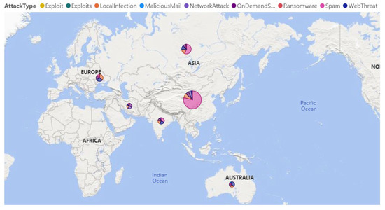 A total of 8199 HTTP requests were made to translate non-English tweets. These data were processed by a social media agent. Apart from the social media data, 238,220 cyber threat data were obtained and processed by the web media agent during the same timeframe (13 October 2022 to 6 April 2023). As seen from Table 5, the web media agent collected about 30K attack statistics for each of the eight different attack types (e.g., exploits, local infections, malicious mail, network attacks, on-demand scans, ransomware, spam, and web threats). Kaspersky is a trusted provider of cyber threat statistics and follows multi-dimensional cyber-attack data obtained by web media agents with web scraping techniques: