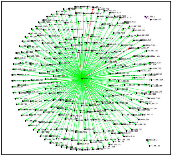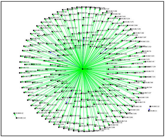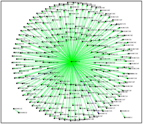 As seen from Figure 2, Figure 3 and Figure 4, the Reconnaissance Tactic resembles the star motif, in which there is a central vertex from which the connections originate. All connections originate from the central vertex of 143.88.2.10. This indicates active scanning [26], typical of a Reconnaissance Tactic. In active scanning, an adversary probes a victim’s infrastructure network traffic by mechanisms such as port scanning. Port scanning classifies each port into a state of open, closed, filtered, unfiltered, open/filtered, or closed/filtered [27]. This helps an attacker determine which ports on a network are open and can be utilized to receive and send data. Figure 2, Figure 3 and Figure 4 represent the Reconnaissance motif by connection count, average duration, and average bytes, respectively.