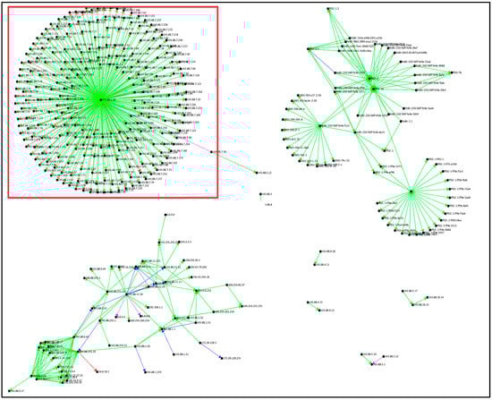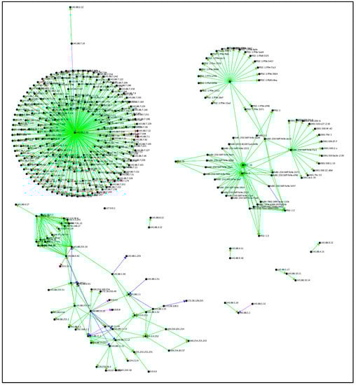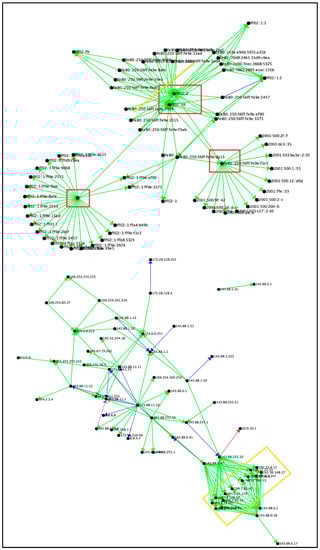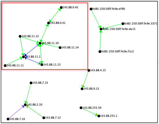 Figure 6 depicts the counts of connections that were categorized as non-attacks and shows a large cluster of different connections of IPv6 addresses. There are several areas of interest identified by the colored boxes. The IP addresses within the red boxes are routers or switches that are redirecting traffic to different subnets (ff02::fb and ff02::1:3), and these subnets are possibly redirecting it to servers or load balancers.