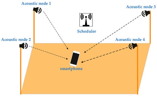- Smartphone outside of the rectangle of four nodes: When the Smartphone is outside the acoustic nodes, fingerprint positioning can be used. In addition, increasing the number of acoustic nodes and using time-division, space-division, and code-division technologies can also achieve localization.