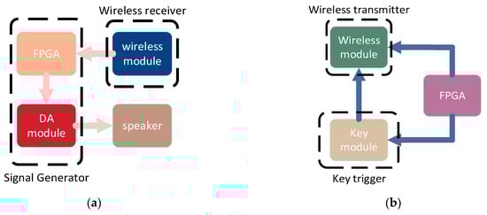 To describe the hardware in more detail, the DAC module is used to convert the digital signal to the output of the analog acoustic signals and drive the speaker into vibrations of the membrane, which are transmitted through the medium of air. The key module is reserved to start or stop the system. The FPGA in the acoustic node has two functions: (1) storing the signal without losing data. (2) controlling and managing different modules.