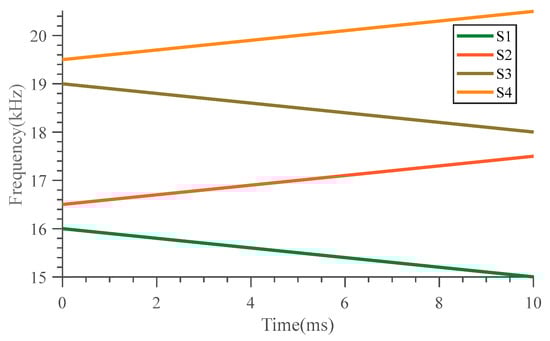 where is the starting frequency and is the cut-off frequency. A is the amplitude of the signal. T is the duration of the chirp signal. Let’s make . If , the chirp signal is up-chirp. If , the chirp signal is down-chirp. In order to distinguish four acoustic nodes, we design four chirp signals with different frequency bands. In order to reduce the impact of environmental noise, all acoustic nodes transmit signals with frequencies above 15 kHz. The frequency of the signal transmitted by acoustic node 1 is 16–15 kHz. The frequency of the signal transmitted by acoustic node 2 is 16.5–17.5 kHz. The frequency of the signal transmitted by acoustic node 3 is 19–18 kHz. The frequency of the signal transmitted by acoustic node 4 is 19.5–20.5 kHz.