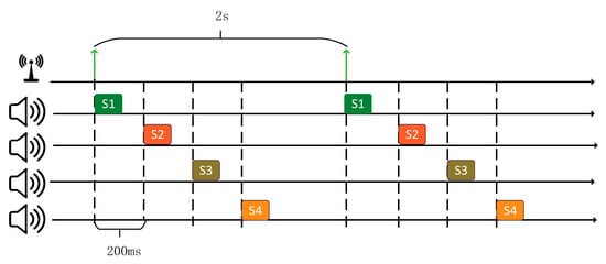 In practice, acoustic nodes transmit signals in turn to avoid signal aliasing. All acoustic nodes in this paper can be scheduled by the scheduler for scheduling time. In this paper, the scheduler transmits a wireless trigger signal every two seconds and when the acoustic nodes receive the trigger signal, acoustic nodes transmit chirp signals in turn every 200 ms. The specific scheduling diagram is shown in Figure 6.