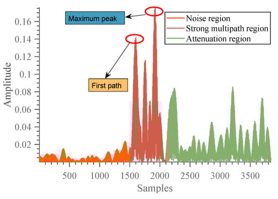 TOA and TDOA of signals are important parameters of trilateration in indoor positioning. TOA of an acoustic signal refers to the time from the signal sent by the acoustic node to the signal received by the microphone receiver. At present, TOA-based acoustic positioning systems require time synchronization between transmitting nodes and receivers. If TOA can be converted into distance information, the target can be located by the trilateral positioning method. TDOA is the difference in time taken between acoustic signals sent from different sources to the target. TDOA measurement does not require synchronization between acoustic nodes and receivers, only synchronization between acoustic nodes. Therefore, the microphone inside the smartphone can act as a receiver. Similarly, the TDOA can be converted into the distance difference, and then the distance difference is used to realize the target position estimation. The measurement accuracy of TOA and TDOA is the key to ensuring positioning accuracy. However, the signal is reflected by the wall and ground (i.e., multipath effect), and the accuracy of TOA and TDOA estimation is affected in practical applications. Therefore, reliable TDOA estimation is also an important work. As shown in Figure 7, the maximum peak obtained by the correlation operation lags behind the first path due to the influence of the multipath effect. Identifying reflected signals and direct signals is also the key to determining positioning accuracy. Since TDOA does not need the clock synchronization between the mobile phone and the acoustic node, we can use TDOA information to achieve indoor positioning for smartphones.