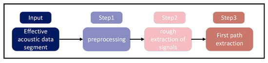 In order to obtain the TOA of the corresponding signal emitted by the acoustic node, we follow the process shown in Figure 8. The effective acoustic data segment contains the corresponding signals of all acoustic nodes, and the length of the effective acoustic segment is 2 s. The whole process is divided into three steps, as shown in Figure 8 below.