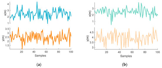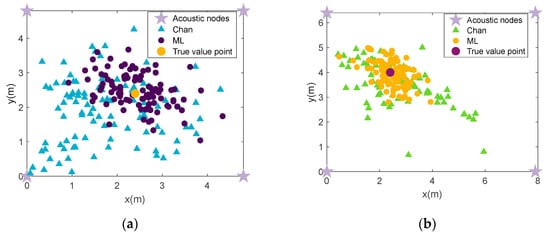 We simulate and analyze these two positioning methods to obtain a robust positioning algorithm for two scenes. The first scene is 4.8 m × 4.8 m in size. The second scene is 6.4 m × 7.9 m in size. We set the standard deviation of noise to 1. The distribution of acoustic nodes and test points is shown in Figure 10. In scenario 1, the coordinates of the four acoustic nodes are (0.0 m, 0.0 m), (4.8 m, 0.0 m), (4.8 m, 4.8 m), (0.0 m. 4.8 m). We select the test points A (2.4 m, 2.4 m) in scenario 1. In the simulation of scenario 2, the coordinates of the four acoustic nodes are (0.0 m. 0.0 m), (0.0 m, 6.4 m), (7.9 m, 6.4 m), (7.9 m, 0.0 m). We select the test points B (2.4 m, 4 m) in scenario 2. Simulating 100 times at each test point (A and B). The positioning results of point A and point B are as shown below: