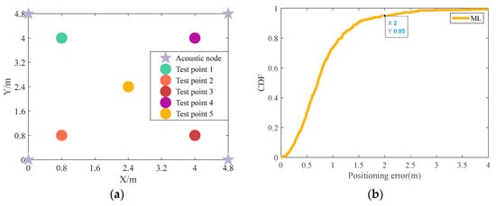 Positioning simulation of scenario 1: (a) distribution of acoustic nodes and test points in scenario 1; (b) the CDF diagram of scenario 1.