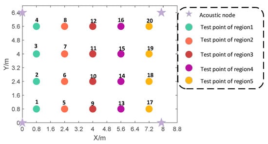 In this paper, we chose two experimental scenarios. Scenario 1 is in the lounge on the fourth floor of Luojia Laboratory, Wuhan University. Scenario 2 is in the lobby on the second floor of Luojia Laboratory, Wuhan University. The distribution of acoustic nodes and test points in scenario 1 is shown in Figure 12a. The distribution of acoustic nodes and test points in scenario 2 is shown in Figure 13.
