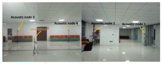 In two experimental scenarios, the acoustic node deployment shape is rectangular. In Scenario 1, the coordinates of the four acoustic nodes are (0.0 m, 0.0 m, 1.72 m), (0.0 m, 4.8 m, 1.72 m), (4.8 m, 0.0 m, 1.72 m) and (4.8 m, 4.8 m, 1.72 m). In scenario 1, the height of the smartphone is the same as the height of the acoustic nodes. The purpose is to verify the reliability of the algorithm in this paper. In scenario 2, the coordinates of the four acoustic nodes are (0.0 m, 0.0 m, 1.72 m), (0.0 m, 6.4 m, 1.72 m), (7.9 m, 0.0 m, 1.72 m) and (7.9 m, 6.4 m, 1.72 m). In Scenario 2, the height of the smartphone is 1.30 m. The process of deploying acoustic nodes is as follows: First, we adjust the height of the acoustic nodes. Then we use the plumb line to align the square acoustic nodes with the top of the square floor tile. Similarly, we also use the plumb line to align the smartphone with the top of the floor tile. The experimental diagram of scenario 2 is shown in the following Figure 14: