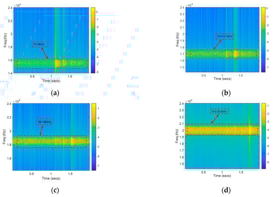 In the experiment, we used a smartphone to record 5 min acoustic data at each test point. The recorded data will be processed and analyzed with the MATLAB platform. The length of time for each effective acoustic data segment is 2 s. In order to describe the results of each processing stage more vividly, we choose test point C (0.8 m, 4 m) in scenario 1 as an example. First, we set four different filters (FIR1, FIR2, FIR3 and FIR4) to filter the effective acoustic data segment (This process corresponds to step 1 of Figure 8). We can obtain four filtered signals by using four filters. Four filtered signals are obtained, which are recorded as F1, F2, F3 and F4. In order to illustrate the effect of the four filters, we drew the time-frequency diagram.