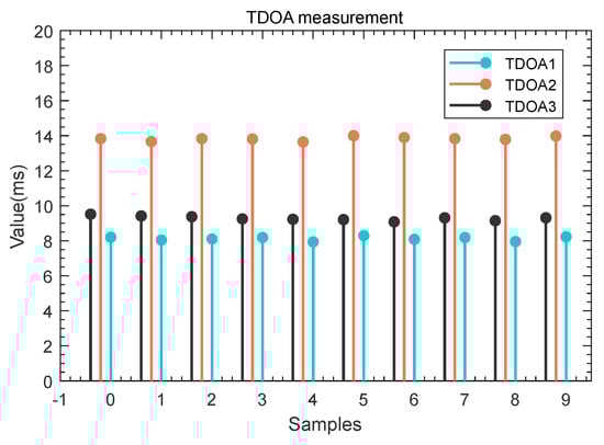 From Figure 16, it can be seen that the four signals can be decoded by simple cross-correlation operation. In order to ensure the robustness of decoding, we implement the decoding method by using algorithm 1 in this paper. Algorithm 1 includes not only decoding but also signal extraction (This process corresponds to step 2 of Figure 8). After P1, P2, P3 and P4 are extracted by using Algorithm 1, we use Algorithm 2 for TOA estimation (this process corresponds to step 3 of Figure 8). In the experiment, we obtained 100 results for each test point. To make it easier to see the TDOAs measurement results at test point C, we selected the first 10 TDOA measurement results to display as follows: