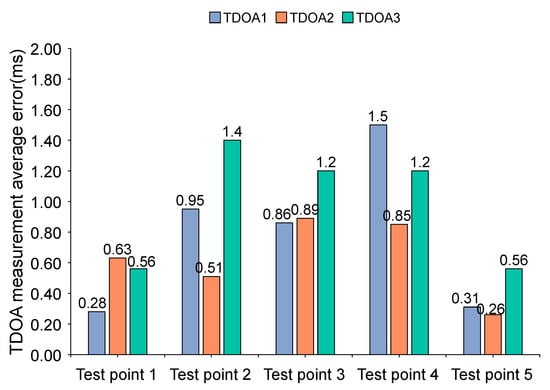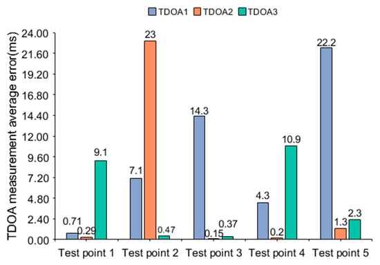 As can be seen from Figure 19, TDOAs measurement average error has significantly decreased compared to Figure 18. In test point 1, the TDOA2 measurement average error is the maximum value (0.6 ms). In test point 2, TDOA3 measurement average error is the maximum value of (1.4 ms). In test point 3, TDOA3 measurement average error is the maximum value (1.2 ms). In test point 4, the TDOA1 measurement average error is the maximum value (1.5 ms). In test point 5, the TDOA3 measurement average error is the maximum value (0.56 ms). All TDOA measurement average errors are less than 1.6 ms (corresponding distance difference error is 54.4 cm), which provides a prerequisite for achieving decimeter-level positioning in scenario 1. When we use the ML algorithm for positioning, the results will be more stable. To further illustrate the better stability of our TDOA measurement method, we will display the data in Figure 18 and Figure 19 by using a line chart.