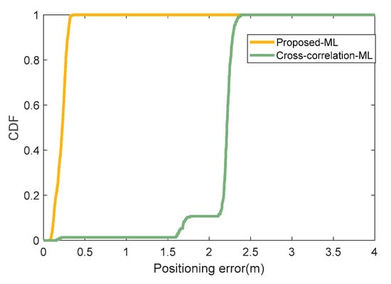 As can be seen from Figure 20, the proposed method has better stability for TDOA measurement. In Figure 20a, the measurement average error of TDOA1 varies between 0.2 ms and 1.6 ms, the measurement average error of TDOA2 varies between 0.2 ms and 1 ms, and the measurement average error of TDOA3 varies between 0 ms and 1.5 ms. In Figure 20b, the measurement average error of TDOA1 varies between 0 ms and 23 ms, the measurement average error of TDOA2 varies between 0 ms and 23 ms, and the measurement average error of TDOA3 varies between 0 ms and 12 ms. So, it can be seen that the proposed method shows good stability. At the same time, it can be seen that the proposed method has a relatively low measurement error in all TDOA measurements. After we obtain TDOAs, we perform the localization function by using the ML algorithm. We refer to the floor tiles to obtain an approximate true value of the smartphone’s position. Then we calculate the CDF with two methods (Proposed-ML and Cross-correlated-ML), as shown in the following Figure 21.