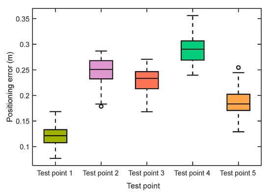 In Scene 1, we found that the results of using the cross-correlation-ML algorithm for localization at testing points 2 and 4 tend toward infinity. Therefore, in Figure 22, we do not show the localization results for testing points 2 and 4 when using the Cross-correlation-ML method. By using the algorithm proposed in this paper, high-precision localization results were obtained in the localization experiment in Scene 1. In Scene 1, each test point was located 100 times. We used box plots to display the localization results obtained using the proposed algorithm in Scene 1.