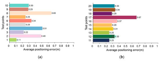 Average positioning error in scenario 2 (using Proposed-ML algorithm): (a) Average positioning error of test points 1–10; (b) Average positioning error of test points 11–20.