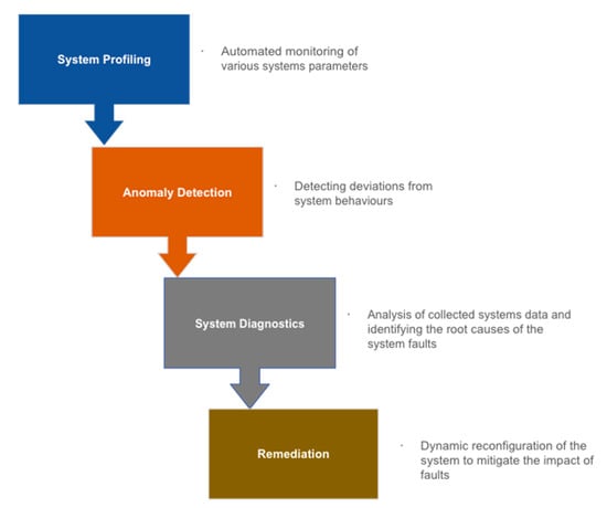 Self-healing functions can be implemented in four stages (Figure 5). These include profiling the system’s normal states, detecting the system’s deviation from its normal state, diagnosing the system’s failures, and taking corrective actions to mitigate the impact of the system’s failure. The choice of profiling algorithm for a self-healing system is dependent on the scope of the design requirements and based on further considerations such as: