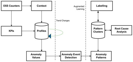 The illustration of anomaly detection and diagnosis for radio access networks (RANs) (Figure 6) shows the profiling, detection, and diagnosis of anomaly events related to RANs. The self-healing function is implemented according to a selected event context, like when a threat event occurs. The key performance indicators (KPIs) are calculated when a profile is created within a time-series format. The anomaly events that are unique in characteristics are detected based on their anomaly level. The diagnosis function then analyses the detected anomaly occurrences. The diagnosis function then identifies the root causes of the anomaly events to ascertain whether corrective measures are required or not to lessen the potential threats, and the corrective workflow is then triggered if indeed needed [10]. The major problem that affects the optimal performance of the smart grid network today is the occurrence of system failures caused by multifaceted fault areas, such as system overload, system intrusion, and system misconfiguration, among others [1]. Such failures within the smart grid can cause significant economic setbacks, with consequences that sometimes negatively impact human livelihoods or quality of life. To mitigate the problem of the system’s inability to self-heal after failures, Ref. [1] proposed using a fault-solving strategy library based on a twin model system and machine learning (ML) algorithm to implement a self-healing mechanism in a smart grid. The algorithm will be fed into the dataset derived from the fault-solving library to detect anomalies within the system. Then, the self-healing function is trigged once the classification process is completed and a viable mitigation solution is found. Self-healing methods can be helpful in a variety of contexts where uptime, reliability, and performance are critical, such as: