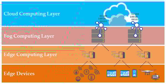 Edge computing refers to a type of computing that is decentralized and allows for data processing to occur closer to the data source, rather than relying on centralized data centers [1]. This approach is particularly advantageous for applications that demand a high bandwidth and low latency, such as autonomous vehicles, Internet of Things systems, and augmented reality applications at the edge of the network [2]. In edge computing, the distribution of tasks among the various nodes in a network is referred to as task allocation. Choosing the best place for each task is one of the primary difficulties of task allocation in edge computing. This is because the different tasks demanding varying amounts of computing power, storage, and network bandwidth. A work that needs real-time processing, for instance, could need to be assigned to a node with high computing power, while a task that needs a lot of storage would need to be assigned to a node with a lot of storage space. Additionally, tasks that are sensitive to network latency may need to be allocated to nodes that are close to the source of the data. This necessitates a trade-off between the node’s computing power, energy usage, and network delay. In Figure 1, we can see the architecture of and edge–fog–cloud computing system.